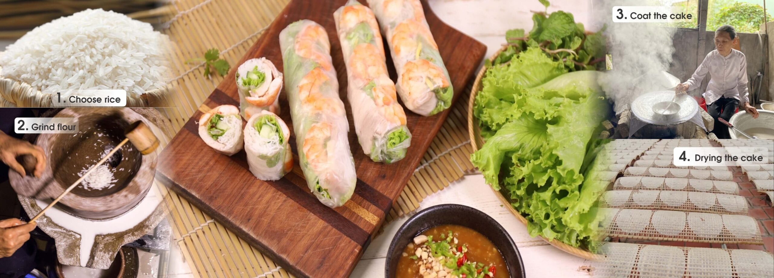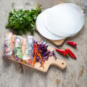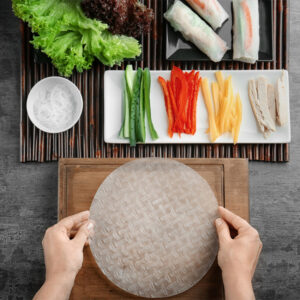1. Vietnamese Rice Paper Spring Roll Wrappers (Banh trang cha gio): Rice flour (~ 70%), tapioca starch (~ 20%), pure water (9.9%), pure salt (0.1%). 2. Vietnamese Rice Paper Fresh Spring Rolls (Banh trang goi cuon): Rice flour (~ 20%), tapioca starch (~ 70%), pure water (9.9%), pure salt (0.1%) Normally, our “Rice Paper Spring Roll Wrappers (Banh trang cha gio)” has more rice flour than “Rice Paper Fresh Spring Rolls (Banh trang goi cuon)”. Having more rice flour makes it less sticky and more crunchy after frying in oil. Meanwhile, having more tapioca starch helps increase the viscosity, so that it is easier to use hands to wrap and roll the rice paper without breaking it, to serve fresh, also the transparency of tapioca starch is greater than rice flour, it allows diners/consumers to see the meat/vegetables, etc. inside, many diners/eaters like it.